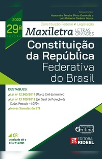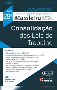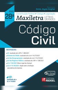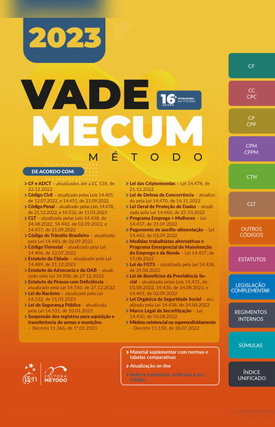ATUALIZADO ATÉ 11.01.2023 CF e ADCT – atualizados até a EC 128, de 22.12.2022Código Civil – atualizado pelas Leis 14.405, de 12.07.2022, e 14.451, de 21.09.2022Código Penal – atualizado pelas Leis 14.478, de 21.12.2022, e 14.532, de 11.01.2023CLT – atualizada pelas Leis 14.438, de 24.08.2022, 14.442, de 02.09.2022, e 14.457, de 21.09.2022Código de Trânsito Brasileiro – atualizado pela Lei 14.440, de 02.09.2022Código Florestal – atualizado pela Lei 14.406, de 12.07.2022Estatuto da Cidade – atualizado pela Lei 14.489, de 21.12.2022Estatuto da Advocacia e da OAB – atualizado pela Lei 14.508, de 27.12.2022Estatuto da Pessoa com Deficiência – atualizado pela Lei 14.510, de 27.12.2022Lei do Racismo – atualizada pela Lei 14.532, de 11.01.2023Lei de Segurança Pública – atualizada pela Lei 14.531, de 10.01.2023Suspensão dos registros para aquisição e transferência de armas e munições – Decreto 11.366, de 1º.01.2023Lei das Criptomoedas – Lei 14.478, de 21.12.2022Lei de Defesa da Concorrência – atualizada pela Lei 14.470, de 16.11.2022Lei Geral de Proteção de Dados – atualizada pela Lei 14.460, de 25.10.2022Programa Emprega Mulheres – Lei 14.457, de 21.09.2022Pagamento de auxílio-alimentação – Lei 14.442, de 02.09.2022Medidas trabalhistas alternativas e Programa Emergencial de Manutenção do Emprego e da Renda – Lei 14.437, de 15.08.2022Lei do FGTS – atualizada pela Lei 14.438, de 24.08.2022Lei de Benefícios da Previdência Social – atualizada pelas Leis 14.431, de 03.08.2022, 14.438, de 24.08.2022, e 14.441, de 02.09.2022Lei Orgânica da Seguridade Social – atualizada pela Lei 14.438, de 24.08.2022Marco Legal da Securitização – Lei 14.430, de 03.08.2022Mínimo existencial no superendividamento – Decreto 11.150, de 26.07.2022 MUITAS VANTAGENS PARA VOCÊ!Índice Alfabético-Remissivo Unificado, incluindo verbetes para CF, Códigos, Estatutos, Legislação Complementar, Regimentos Internos, Súmulas, OJs, Precedentes e Enunciados, para facilitar ainda mais a consulta e ganhar mais tempo nas provas Índice Remissivo por Código Atualização on-line gratuita no formato da páginaMaterial suplementar para download: seleção de normas complementares e tabelas comparativas de reformas e dos principais impactos legislativos O PROJETO GRÁFICO OFERECE:Leitura confortávelCor específica para cada uma das divisõesÍndice Alfabético-Remissivo Unificado As mais recentes atualizações legislativas destacadas em cores Índice das PRINCIPAIS ATUALIZAÇÕES na contracapaFitas marcadoras e tarjas laterais internas Este é o seu mais completo parceiro de estudos e provas! O Vade Mecum Método foi feito cuidadosamente para acompanhá-lo nas provas da OAB, graduação, concursos públicos e no seu dia a dia profissional.