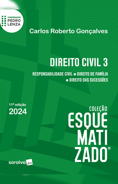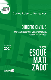 A Saraiva Educação, selo SaraivaJur, apresenta a 11ª edição da obra Direito Civil 3, da Coleção Esquematizado®, do experiente autor Carlos Roberto Gonçalves, com a coordenação de Professor Lenza. Este volume é dedicado à responsabilidade civil, ao direito de família e ao direito das sucessões. A obra é indicada para os alunos de graduação e para os candidatos a concursos públicos, seja da área jurídica ou não jurídica, de nível superior ou mesmo de nível médio. Com projeto gráfico especialmente pensado para otimizar a preparação dos alunos para provas e exames, a metodologia aplicada na obra proporciona ao leitor uma leitura mais dinâmica e estimulante, favorecendo a assimilação do conteúdo. Além de apresentar recursos gráficos e palavras-chaves em negrito durante todo o livro, que favorecem a assimilação dos principais temas, ao final de cada capítulo, o assunto é apresentado em formato de quadro com resumo da matéria e de questões de provas de concursos. Esta edição oferece ao leitor um material super atualizado, repleto de exemplos práticos e sintonizado com a jurisprudência dos tribunais superiores. Esta obra é indispensável para o aluno que deseja compreender os institutos do Direito Civil. Data de fechamento da edição: 30/10/2023.