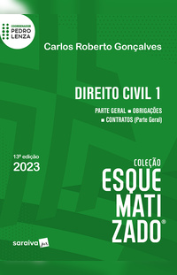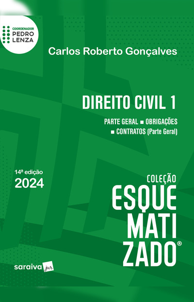 A Saraiva Educação, selo SaraivaJur, apresenta a 14ª edição da obra Direito Civil 1, da Coleção Esquematizado®, do experiente autor Carlos Roberto Gonçalves, com a coordenação de Professor Lenza. Este volume é dedicado à parte geral do direito civil, às obrigações e à parte geral dos contratos. A obra é indicada para os alunos de graduação e para os candidatos a concursos públicos, seja da área jurídica ou não jurídica, de nível superior ou mesmo de nível médio. Com projeto gráfico especialmente pensado para otimizar a preparação dos alunos para provas e exames, a metodologia aplicada na obra proporciona ao leitor uma leitura mais dinâmica e estimulante, favorecendo a assimilação do conteúdo. Além de apresentar recursos gráficos e palavras-chaves em negrito durante todo o livro, que favorecem a assimilação dos principais temas, ao final de cada capítulo, o assunto é apresentado em formato de quadro com resumo da matéria e de questões de provas de concursos. Esta edição oferece ao leitor um material superatualizado, repleto de exemplos práticos e sintonizado com a jurisprudência dos tribunais superiores. Esta obra é indispensável para o aluno que deseja compreender os institutos do Direito Civil. Data de fechamento da edição: 23/10/2023.