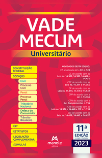 A Editora Manole, mais uma vez acompanhando as necessidades dos profissionais e dos estudantes, viabiliza agora uma edição de coletânea legislativa contendo: Constituição Federal, Códigos (Civil, de Processo Civil, Penal, de Processo Penal, Tributário Nacional, de Defesa do Consumidor e de Trânsito Brasileiro), CLT, Estatutos (da Criança e do Adolescente,da OAB, da Cidade, da Pessoa Idosa, do Desarmamento, da Microempresa e da Empresa de Pequeno Porte, da Igualdade Racial, da Juventude e da Pessoa com Deficiência), legislação complementar, súmulas do STF, do STJ e do TST, orientações jurisprudenciais e precedentes normativos do TST.A legislação desta edição está atualizada até o dia 11.01.2023.