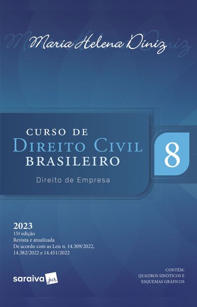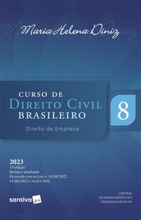 Referência no estudo do Direito Civil, a eminente Professora Maria Helena Diniz dedica-se a apresentar os principais temas da matéria nos oito volumes do Curso de Direito Civil Brasileiro. Notadamente conhecida por sua didática, fruto de anos no magistério, preocupa-se em apresentar ao final da exposição teórica os pioneiros quadros sinóticos, proporcionando uma visão sintética do conteúdo abordado no capítulo. No volume 8 a autora registra de forma didática, simples e objetiva, suas interpretações do Livro II da Parte Especial do Código Civil, desvendando seu conteúdo ante a complexidade dos institutos e dos conceitos peculiares nele compreendidos e a amplitude de significado das normas sobre direito de empresa, sem olvidar das questões controvertidas por elas engendradas. (Títulos de crédito e contratos mercantis foram abordados no v. 3 do curso). Revista e atualizada de acordo com as Leis n. 14.309/2022, 14.382/2022 e 14.451/2022. Data de fechamento da edição: 11-11-2022.