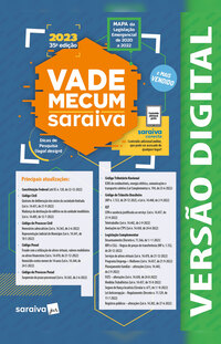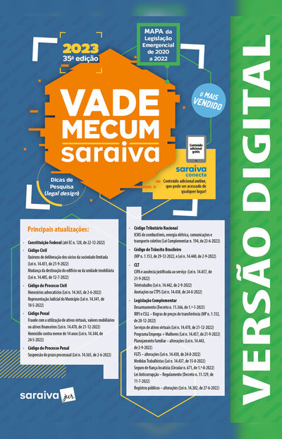 Data de Fechamento da obra: 5-1-2023Você já conhece o Vade Mecum Saraiva Digital? O Vade Mecum Saraiva digital é a versão ePub da obra de legislação mais vendida no Brasil há mais de 15 anos. Com navegação amigável e intuitiva, seu conteúdo é selecionado de acordo com a grade curricular das principais faculdades de direito e com base em editais de concursos para carreiras jurídicas. Tudo revisto e atualizado a cada reedição! Nele você terá acesso e poderá buscar diversos assuntos por meio de índices multifuncionais, que permitem rápida localização de qualquer assunto por ordem alfabética, cronológica, pelo número do diploma ou por seu tema, tudo de maneira rápida, através de links, ferramenta exclusiva do Vade Mecum Saraiva digital. Além disso, você poderá personalizar seu Vade Mecum Saraiva, destacando o que for mais importante ou até mesmo compartilhando conteúdos relevantes. Acesse tudo isso a qualquer momento e de onde estiver! Nesta edição, você ainda terá:- Dicas de Pesquisa (legal design) - tutorial sobre como consultar a legislação e utilizar seu Vade Mecum; - Mapa da Legislação Emergencial de 2020 a 2022 com os temas de maior relevância no enfrentamento da pandemia.Principais Atualizações da 35.ª edição: Constituição Federal (até EC n. 128, de 22-12-2022) Código Civil Quóruns de deliberação dos sócios da sociedade limitada (Lei n. 14.451, de 21-9-2022) Mudança da destinação do edifício ou da unidade imobiliária (Lei n. 14.405, de 12-7-2022 Código de Processo Civil Honorários advocatícios (Lei n. 14.365, de 2-6-2022) Representação Judicial do Município (Lei n. 14.341, de 18-5-2022) Código Penal Fraude com a utilização de ativos virtuais, valores mobiliários ou ativos financeiros (Lei n. 14.478, de 21-12-2022) Homicídio contra menor de 14 anos (Lei n. 14.344, de 24-5-2022) Código de Processo Penal Suspensão do prazo processual (Lei n. 14.365, de 2-6-2022) Código Tributário Nacional ICMS de combustíveis, energia elétrica, comunicações e transporte coletivo (Lei Complementar n. 194, de 23-6-2022) Código de Trânsito Brasileiro (MP n. 1.153, de 29-12-2022, e Lei n. 14.440, de 2-9-2022) CLTCIPA e ausência justificada ao serviço (Lei n. 14.457, de 21-9-2022) Teletrabalho (Lei n. 14.442, de 2-9-2022) Anotações na CTPS (Lei n. 14.438, de 24-8-2022) Legislação Complementar Desarmamento (Decreto n. 11.366, de 1º-1-2023) IRPJ e CSLL - Regras de preços de transferência (MP n. 1.152, de 28-12-2022) Serviços de ativos virtuais (Lei n. 14.478, de 21-12-2022) Programa emprega + mulheres (Lei n. 14.457, de 21-9-2022) Planejamento familiar - alterações (Lei n. 14.443, de 2-9-2022) FGTS - alterações (Lei n. 14.438, de 24-8-2022) Medidas trabalhistas (Lei n. 14.437, de 15-8-2022) Securitização e Letra de Risco de Seguro (Lei n. 14.430, de 3-8-2022) Seguro de fiança locatícia (Circular n. 671, de 1.º-8-2022) Lei Anticorrupção - Regulamento (Decreto n. 11.129, de 11-7-2022) Registros Públicos alterações (Lei n. 14.382, de 27-6-2022)