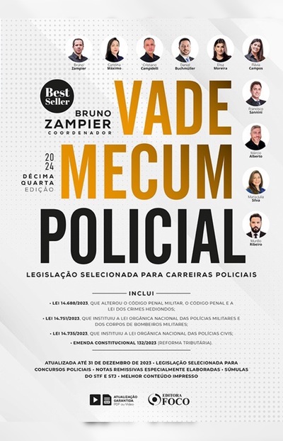 CONTEÚDO: – Atualizada até 31 de dezembro de 2023; – Legislação selecionada para concursos policiais; – Notas remissivas especialmente elaboradas; – Súmulas do STF e STJ; – Melhor conteúdo impresso. – Atualizada até 31/12/2023 Conforme: - Lei 14.688/2023, que alterou o Código Penal Militar, o Código Penal e a Lei dos Crimes Hediondos; - Lei 14.751/2023, que instituiu a Lei Orgânica Nacional das Polícias Militares e dos Corpos de Bombeiros Militares; - Lei 14.735/2023, que instituiu a Lei Orgânica Nacional das Polícias Civis; - Emenda Constitucional 132/2023 (Reforma Tributária). APRESENTAÇÃO Seja muito bem-vindo à 14ª Edição do VADE MECUM POLICIAL! Após o sucesso das nove primeiras edições, que se esgotaram, apresentamos esta, ainda mais completa e focada nos concursos policiais. Como professor de cursos preparatórios para concursos públicos desde o ano de 2002, percebemos claramente a cobrança cada vez mais específica e relacionada ao cargo pretendido. É a chamada pertinência temática. Neste sentido, inicia-se a busca pela melhor preparação possível, devendo o candidato frequentar cursos, ler doutrina e jurisprudência direcionadas e, claro, ter acesso à vasta legislação exigida pelos editais. É o que naturalmente ocorre também no âmbito das carreiras policiais, a exemplo de Delegado de Polícia, Agente, Investigador, Escrivão, Papiloscopista, Perito Criminal, Policial Rodoviário Federal, Oficial ou Soldado das Polícias Militares. A preparação para tais concursos envolve o acesso a legislação específica, confecção de peças de polícia judiciária, testes de aptidão física, exames médicos rigorosos, investigação social, aprovação em cursos de formação promovidos por academias de polícia entre outros desafios. Com o objetivo de atender aos seus anseios em busca do objetivo final, as principais leis exigidas nos concursos policiais foram reunidas e sistematizadas por uma experiente equipe de professores. Elaboramos uma criteriosa remissão de artigos e súmulas a fim de facilitar os estudos de nosso futuro colega policial: você! Foi desta forma que criamos o produto que agora tem em suas mãos e que certamente colaborará não apenas em sua jornada como candidato, mas também no exercício da nobre profissão de policial. Aos estudos! Bruno Zampier