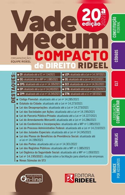 A edição 2022 do Vade Mecum Compacto de Direito traz projeto gráfico moderno, o que torna sua leitura agradável e a pesquisa pelo conteúdo rápida e dinâmica. O produto apresenta compêndio de normas fundamentais, sem exageros, para o dia a dia de profissionais, acadêmicos e concurseiros, além de CF, principais Códigos, Legislação Complementar Geral e Súmulas dos Tribunais Superiores. Conta, ainda, com índices sistemáticos e alfabético-remissivos. Para facilitar ainda mais a consulta do leitor, a capa traz um guia referencial de pesquisa.